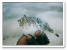 When we arrived, Phillip stopped the boat. We couldn't go any further. We got out and the water was a little under calf depth. He went into my kit bag and came out with a box of flies, some tippet and my camera. We started slowly walking. The bottom was firm, white coral sand and littered with big, red starfish, strange looking sponges and panicky little puffer fish. We walked about 500 metres in water that was getting gradually shallower, to just over ankle depth. He then stopped and pointed out the fishing hole.