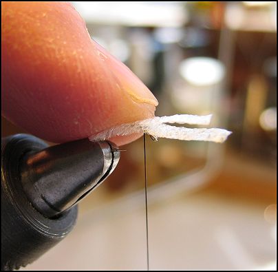 Double over the foam strip and place on the hook shank as shown in the first picture to the right. Hold the foam in place while you tie, as shown in the second picture.