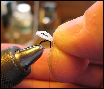 Tie the foam in with a few secure wraps, trim the excess and dub on just a tad of black dubbing.