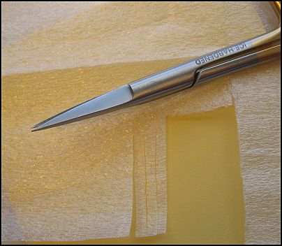 Cut inch-long strips about 1/8" wide for #18 and #20 size hooks, thinner for smaller flies.
