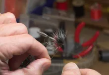 The fly is a favored winter fly - especially in red or orange, but also in black&white tied with badger hackle as shown here, which is quite close to the original. The fly is also seen in a pure black version as well as a light brown, sandy or tan color.