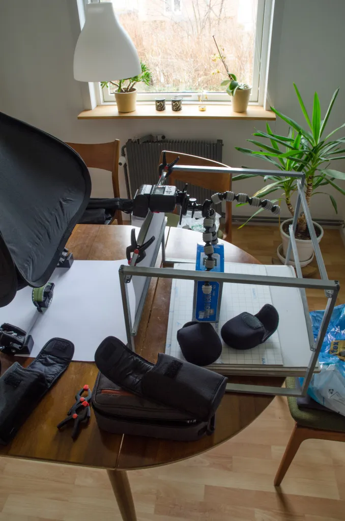 From the left you see the lightbox over the subject, the background paper, the frame that holds the background, the background flash on a Gorillapod
