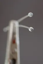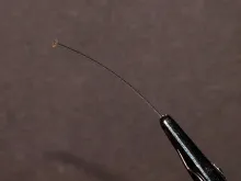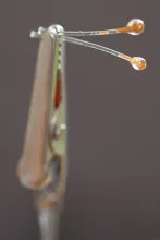 4. Melt the nylon. Mix the epoxy with a drop or two of hobby paint or varnish. Apply to the eyes and let them dry on a fly dryer using painters tape or even better a rubber band to hold the eyes.